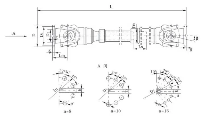 | Ingen. | Gyreringsdiameter D mm | Nominelt dreiemoment Tn KN·m | Aksfoldevinkel β (°) | Slitent dreiemoment Tf KN·m | Flex mengde Ls mm | Størrelse (mm) | Roterende treghet kg.m2 | Vekt (kg) | |||||||||||